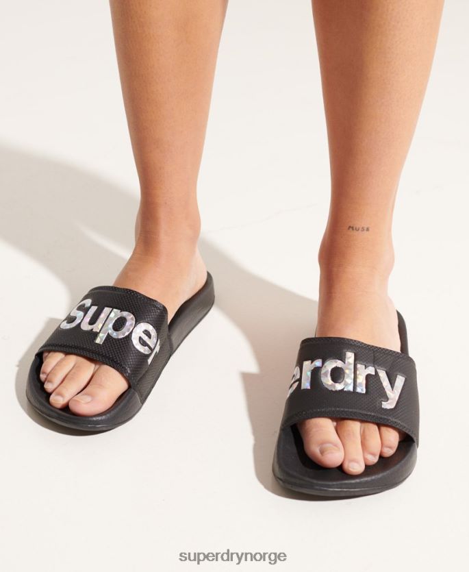 superdry holografiske glidebrytere for infill basseng for kvinner. disse gliderne har en tvers over den øverste fotremmen og støpt fotseng. ferdig med en holografisk superdry-logo på fotremmen og en superdry-merket såle.
