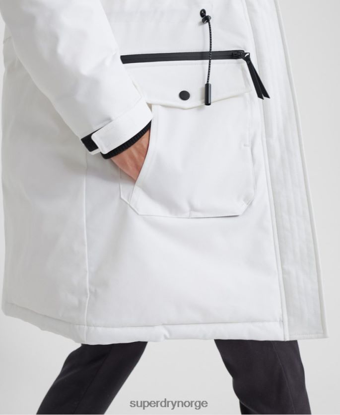superdry aiko everest dunparkajakke for kvinner. hold kulden ute denne sesongen med aiko everest dunparkasjakken, fylt med 90/10 premium andedunfyll. denne jakken har en hette med borrelåskrage og avtagbar fuskepelskant, glidelås og borrelåslukking og snøring i midjen for å justere for komfort. Det finnes også to trykklommer foran med to glidelåslommer bak, samt to glidelåser på brystet kun for estetisk bruk. komplett med ribbestrikkede mansjetter med krok- og løkkejusteringer for ekstra komfort og et superdry-logoemblem på det ene ermet.