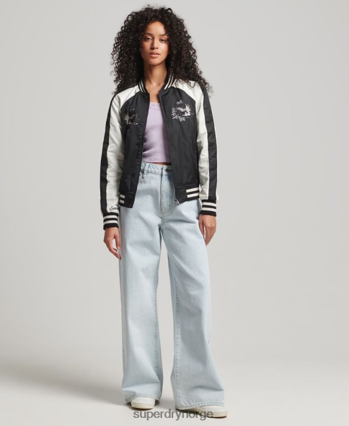 en klassisk bomberjakke med en japansk vri. med brodert grafikk foran og bak, to lommer med trykknapper og ribbestrikket krage, mansjetter og fald.