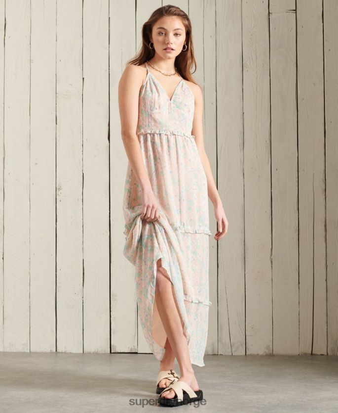 superdry margaux maxi-kjole for kvinner. denne kjolen har justerbare stropper med knytefeste, v-hals, volangdetaljer til skjørtet og glidelås i siden. ferdig med en supertørr metallflik på midjen.