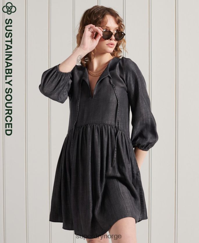 den perfekte dagskjolen, den lange ermede tencel-kjolen har knyting i halsen, nøkkelhullsdetaljer, et lagdelt design, to sidelommer og en metalllogomerke.
