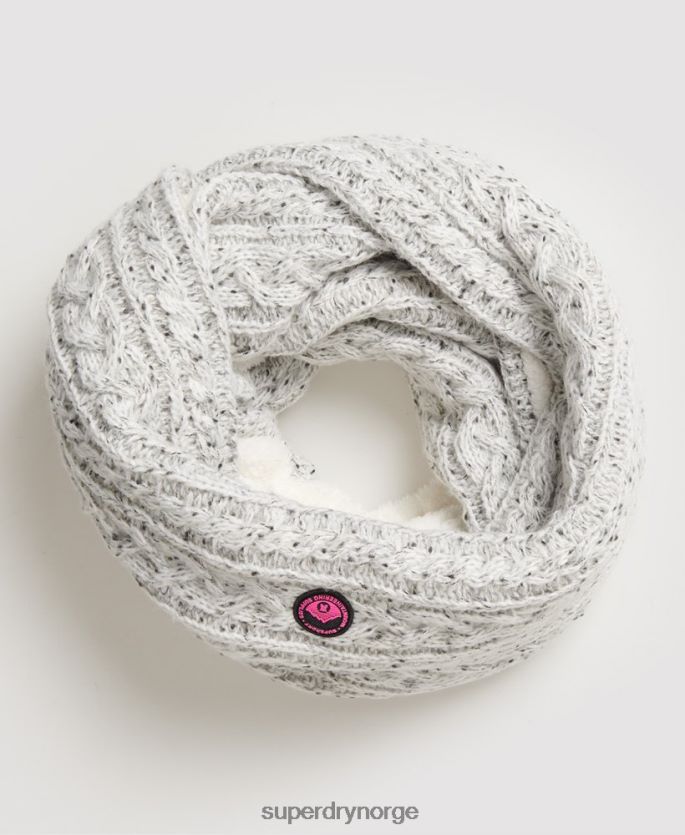 superdry gracie kabelsnod for kvinner. perfekt for de kaldere dagene og en essensiell vintergarderobe, denne snooden er designet med en tykk kabelstrikket ytre og et supermykt borgfôr. komplettert med et superdry-logomerke for fjellklatring i gummi.