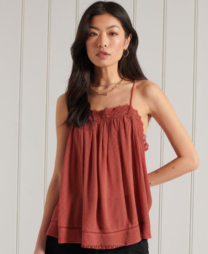 den perfekte sommertoppen denne sesongen, si hei til alana cami-toppen. Dette stykket i bohemstil har vakre blondedetaljer og en lekker racerrygg. avsluttet med en sydd superdry metallflik.